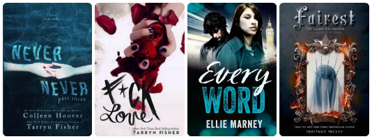 Never Never Part 3 by Colleen Hoover & Tarryn Fisher, Fuck Love by Tarryn Fisher, Every Word by Ellie Marney & Fairest by Marissa Meyer