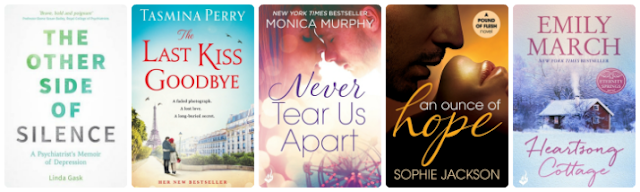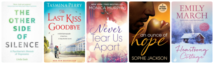 The Other Side of Silence by Linda Gask, The Last Kiss Goodbye by Tasmina Perry, Never Tear Us Apart by Monica Murphy, An Ounce of Hope by Sophie Jackson & Heartsong Cottage by Emily March